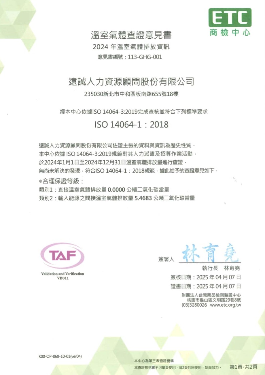 遠誠人力今年度也完成企業溫室氣體的盤查,符合ISO 14064-1 : 2018規範喔! 期待大家一起成為綠色行動的實踐者。